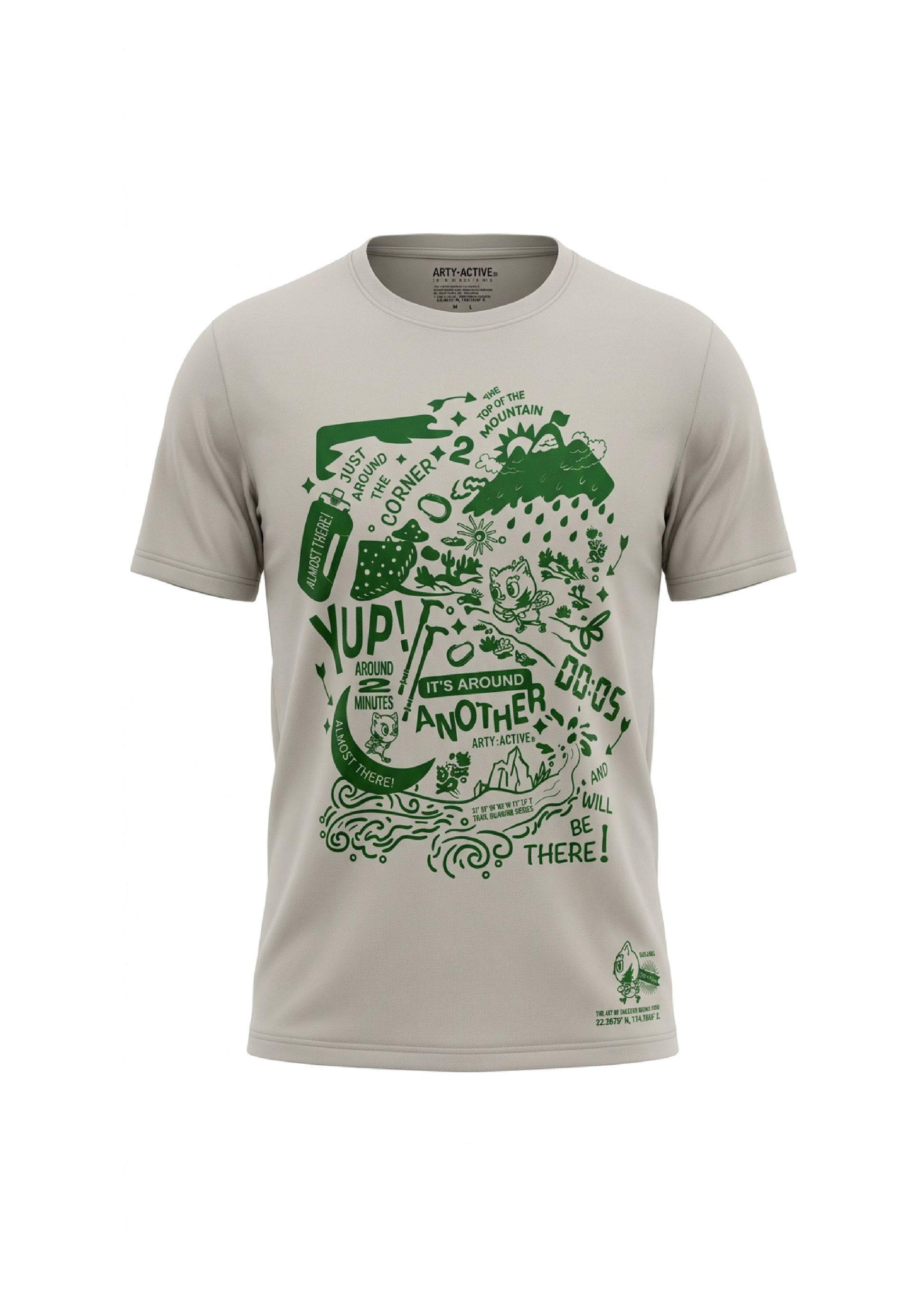 The visual art piece concept that inspired by the interaction moments between the outdoor sports players. While having fun in the outdoor activities in the mountain, some experienced runners will lead in front, and they will use a humorous tone to tell the team behind them that it is “almost there” and “will be there soon” in 20 minutes to encourage the participant.
